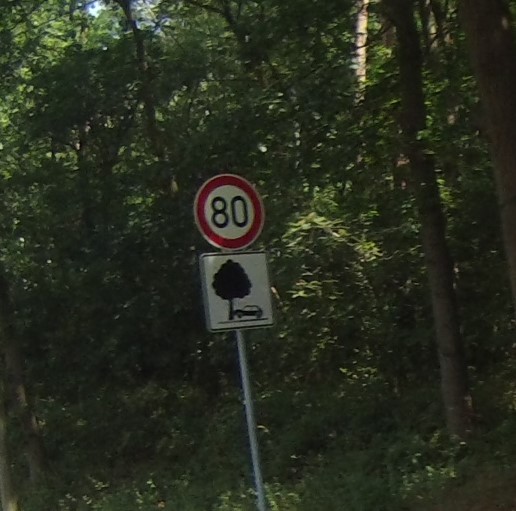 - answers on a postcard for the following sign – does this mean only hit the tree at 80? The tree jumps out at you when you do 80 or more? Any helpful suggestions gratefully received in case we see similar signs on our way back through Germany…