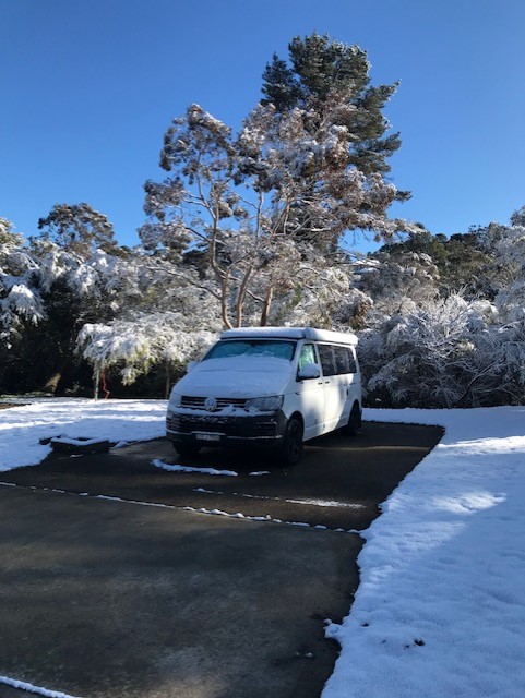 Now, although winter here, it was a respectable 20+ degrees in Sydney so imagine our surprise to be told on arrival at out first campsite that snow was expected. Don’t be daft we replied, this is Australia. However, temperatures started to drop and by night time, it had started to rain….. “It’ll soon pass” said I in true British, stiff upper lip stylie. But it didn’t and what’s more it turned to snow and by morning there was a good couple of inches of the stuff and ice on the INSIDE of the windows!! Luckily we had bought blankets and a heater so we were warm enough and really rather cosy. It was beautiful out and about though and actually quite a treat to see the snow. Fellow campers (all Aussies) were loving it – mostly because they were from areas such as Queensland where this would never be seen. What this has meant, though, is that our first week in Bob has been without the roof up (too cold/windy), without the awning out (too windy) and without the awning tent annexe out (same reasons as before) so we have living, sleeping and eating just inside the van. Now, for those who know Tim, I’ll leave you to have a quiet moment of reflection and contemplation on my behalf…..