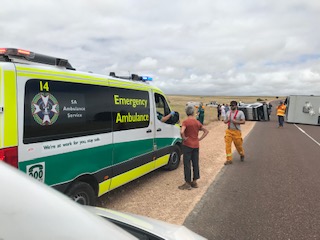 Next up on the drama front was on our way between Streaky Bay and Coffin Bay on the Eyre Penninsular. The long but someimes winding road that is the B100 was pretty but needed more concentration than most. We were on full alert as usual as was the road train in front of us – which is just as well as suddenly we were confronted with a car and caravan on its side across the full width of the road! Both us and the road train driver were straight out of our vehicles to see what was what. Tim stayed back with the van to stop other traffic and me and my road train matey pulled the two passengers out of their overturned vehicle. Amazingly it was just a matter of a few cuts and grazes but the lady (who had been driving) was unsurprisingly shook up and was grateful for my hugs, chair from the van and some water. Other vehicles were soon on the the scene and between us we uncoupled the overturned vehicles and, most importantly, checked their gas cylinders were OFF and no fuel was spilling out. Talk about drama. We waited with them until the emergency services arrived and then, like the others had, decided to leave it to the experts and luckily, sneak through an old track off the main road around the accident site. See, it’s not all a holiday!!!