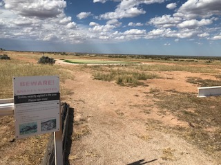 A not-so-typical scene but a very interesting and exciting concept, was the Nullarbor Links. The 18 hole, Par 73 course spans 1,365 kms with holes n a number of participating towns or roadhouses along the Eyre Highway starting in Kalgoorlie in WA and ending in Ceduna in SA. The idea is that you purchase a score card at one of 3 visitor centres along the route and have your card stamped at each of the holes along the way -receiving a certificate on completion. It’s obviously quite an expensive round in terms of both time expended and cost in terms of food and accommodation but plenty have done it and we saw several ‘competitors’ and some of the locations we stayed in. Now, Ben and Tim, there’s an idea for a Haywood Society Away weekend (well fornight)!!! Mind you it must be a bugger being the green keeper…. Actually, the tees and greens are artificial turf and the fairway ‘grass’ is a bit on the long side so I would guess the greenkeeper takes a pretty relaxed view of things. More worringly are the signs to look out for the snakes. Mmm, maybe not such a good idea after all.