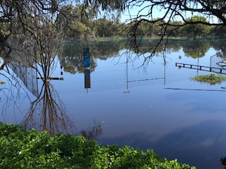 Having droppped him off at the garage, we jumped on the bikes and rode into town. Stopping in the main street for a coffee we were beginning to wonder what all the fuss had been about, although to be fair, we had seen evidence of flooded plains/land on our route in. After coffee we headed down to the riverside – then we understood. The river was gradually rising and expanding with the flow rate in the centre really quite alarming. There was a pumping house building which showed two previous lines where flooding had reached previously – once in 1975 and another in 1956. Although well below the 1956 level, it was highly likely that the 1975 level would be reached as one old guy we got chatting to mentioned that it had raised by about 125mm in one day! It was strange to see how far the river had breached the bank – there would certainly be no games at the Mildura tennis club for a while… Onward travel from Mildura continued to demonstrate just how much flooding had happened – and how many livlihoods may have been lost through flooded land and lost crops.